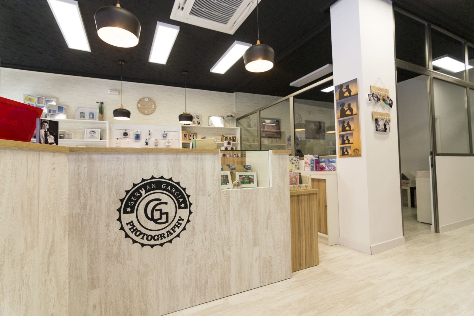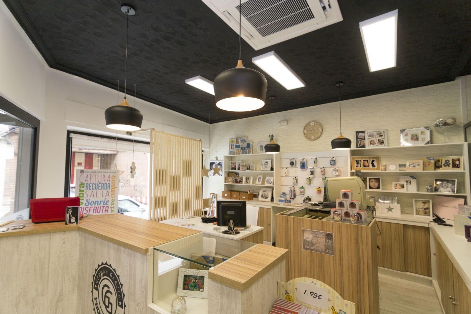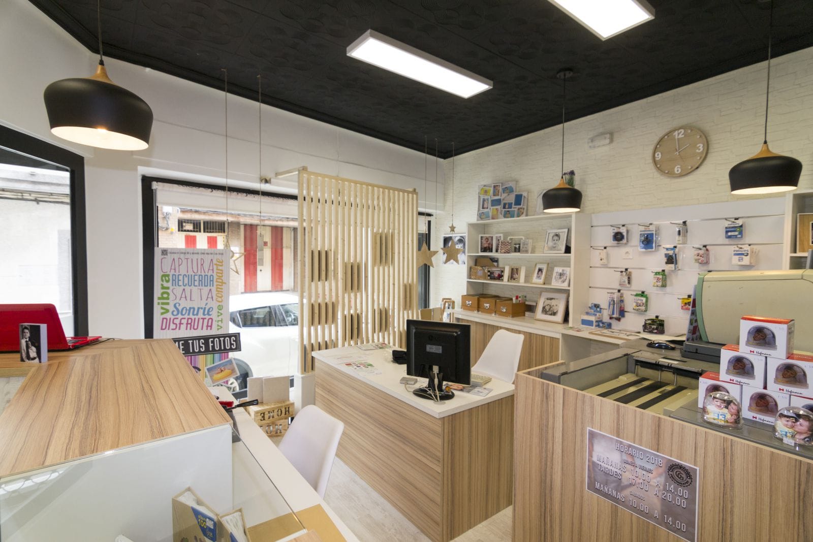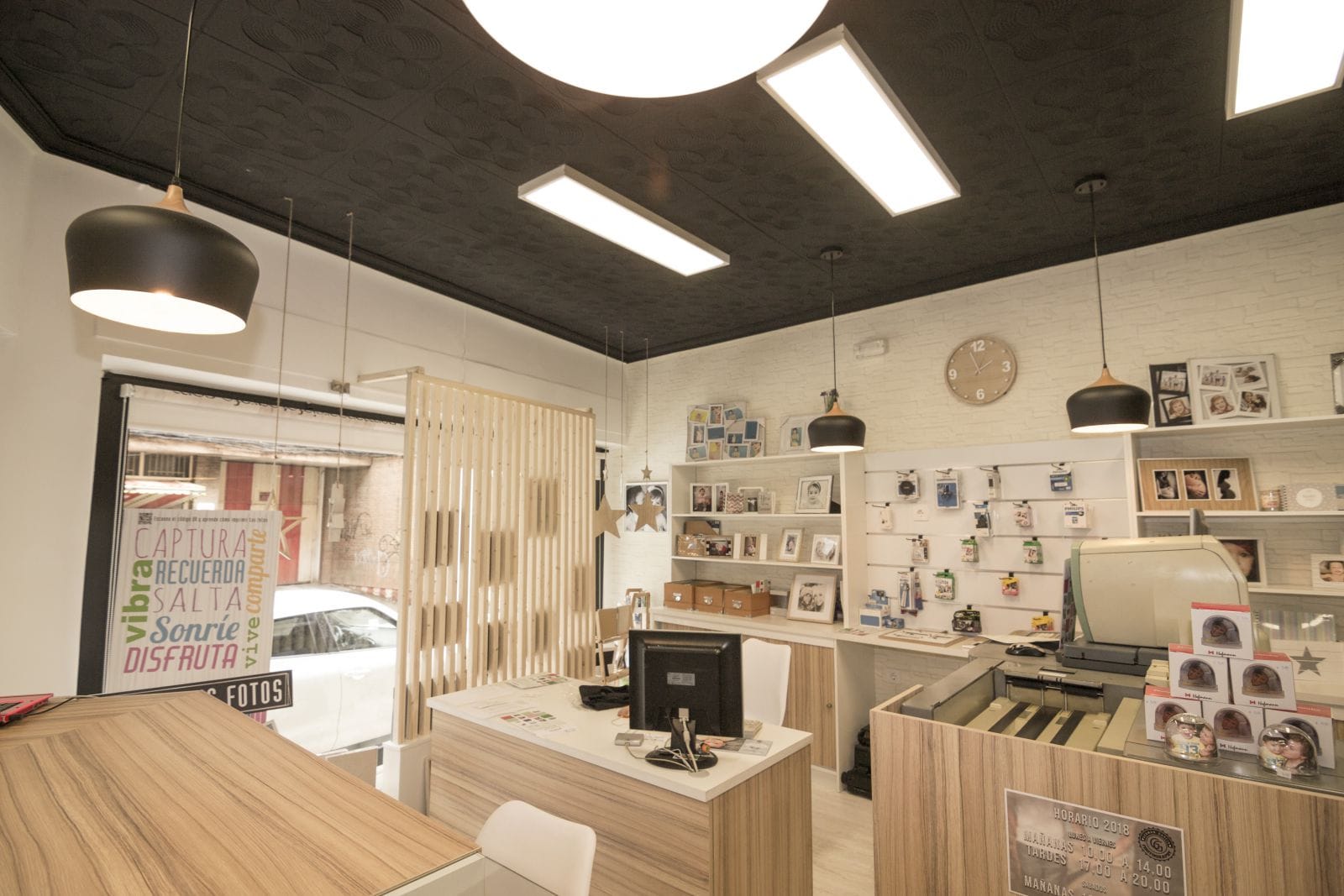 El estudio de fotografía tiene su clientela habitual, pero tambien quiere atraer y atrae a los jovenes apasionados de la fotografía, de las nuevas técnicas y trabajos. Es por eso que quisimos recrear lo clasico, utilizando para ello el blanco y negro como recuerdo a este estilo de fotografía pero actualizandolo mediante el uso de las maderas naturales y toques de estilo vintage e industrial que le aportan caracter. Uno de los elementos que mas pasión ha causado es el techo antiguo, que decidimos desde un primer momento conservar, pero actualizandolo mediante una pintura negra satinada.