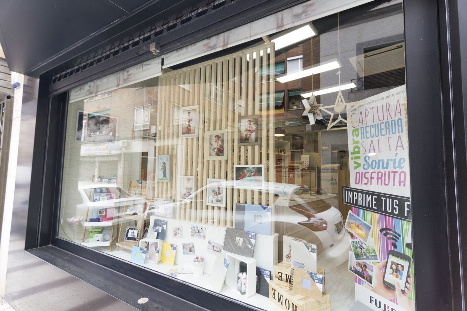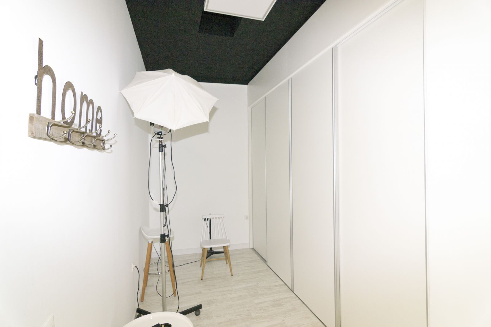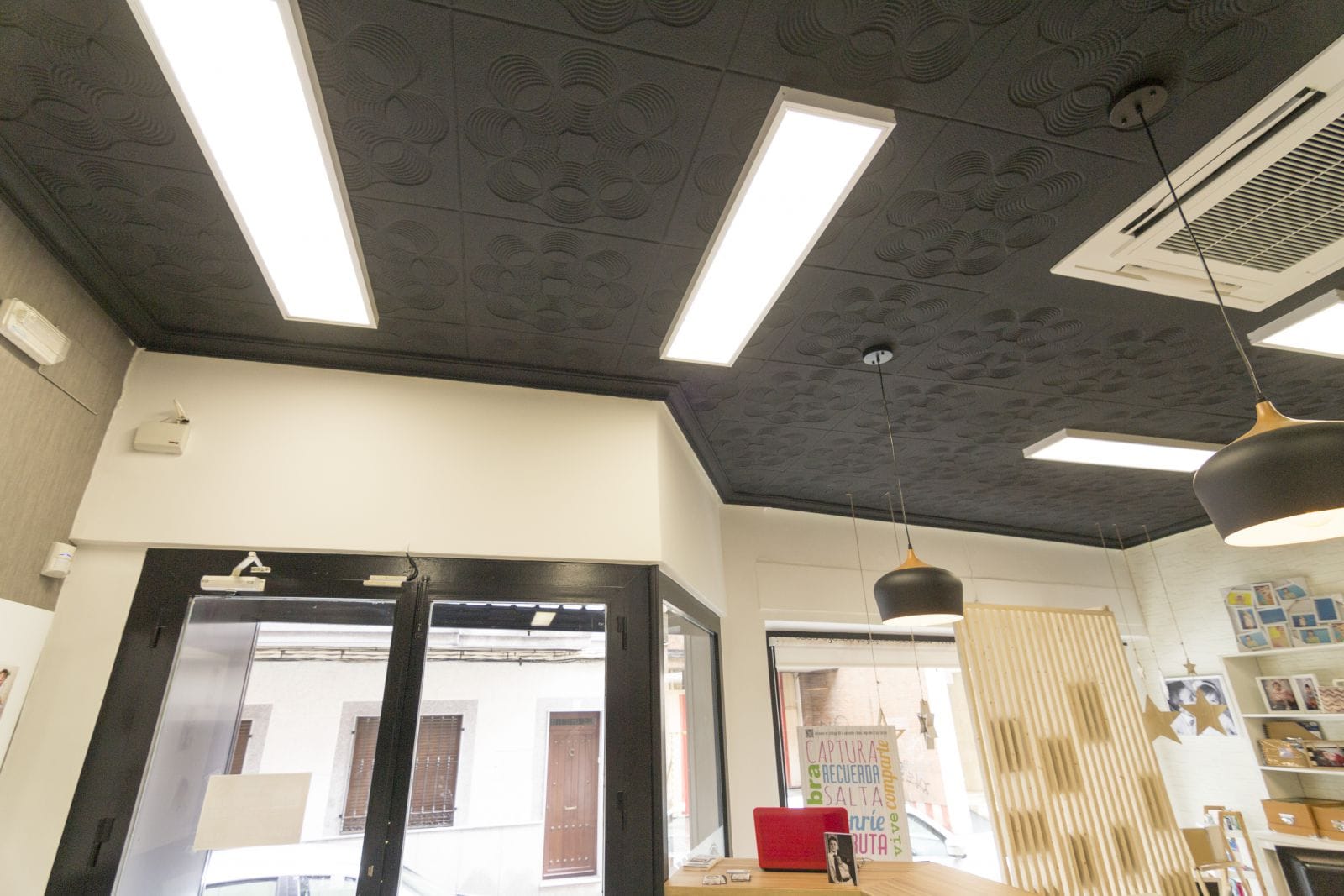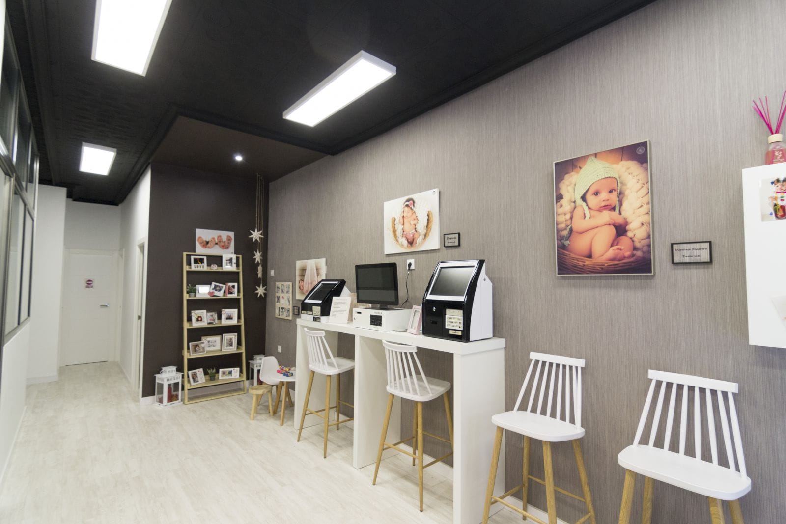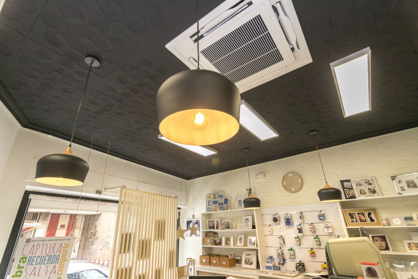 El estudio de fotografía tiene su clientela habitual, pero tambien quiere atraer y atrae a los jovenes apasionados de la fotografía, de las nuevas técnicas y trabajos. Es por eso que quisimos recrear lo clasico, utilizando para ello el blanco y negro como recuerdo a este estilo de fotografía pero actualizandolo mediante el uso de las maderas naturales y toques de estilo vintage e industrial que le aportan caracter. Uno de los elementos que mas pasión ha causado es el techo antiguo, que decidimos desde un primer momento conservar, pero actualizandolo mediante una pintura negra satinada.