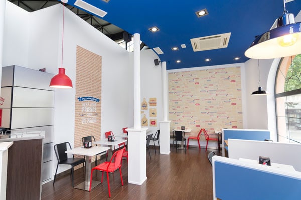 Nuestro reto y nuestra propuesta, pasaba por implantar correctamente la imagen de Dominós, pero respetando al máximo las singularidades de este edificio. Como la planta circular, los grandes ventanales con forma de arco y los techos a doble altura.
