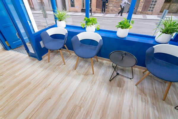 Pero no queríamos que resultara demasiado frio , ni aséptico, demasiado industrial….sino que resultara natural y cálido y para eso el elemento perfecto escogido fue la madera, además en un tono muy claro y con efecto desgastado.